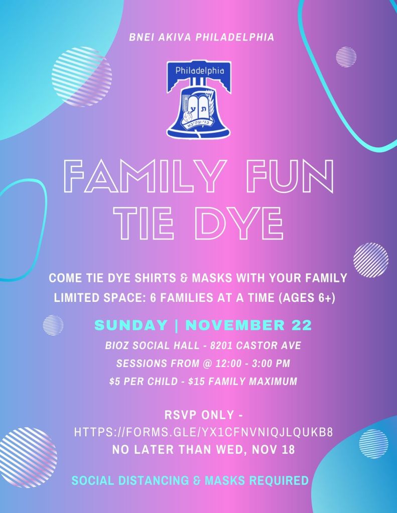 Events, Uncategorized Tie Dye Event 5781 Posted by bneiakivaphilly on November 3, 2020November 3, 2020 On November 22, Bnei Akiva of Philadelphia will be hosting a fun-filled tie dye event for chanichim, madrichim, and their families! Can’t wait to see you there and don’t forget to RSVP! Share this: Click to share on X (Opens in new window) X Click to share on Facebook (Opens in new window) Facebook Like Loading...